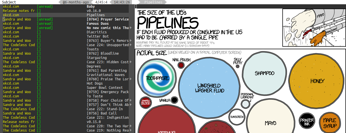 Emacs handles feeds very well too. The packages I'm using here are Elfeed and Elfeed goodies. Emacs can even show images in the feeds, so it covers everything I need from a feed reader.